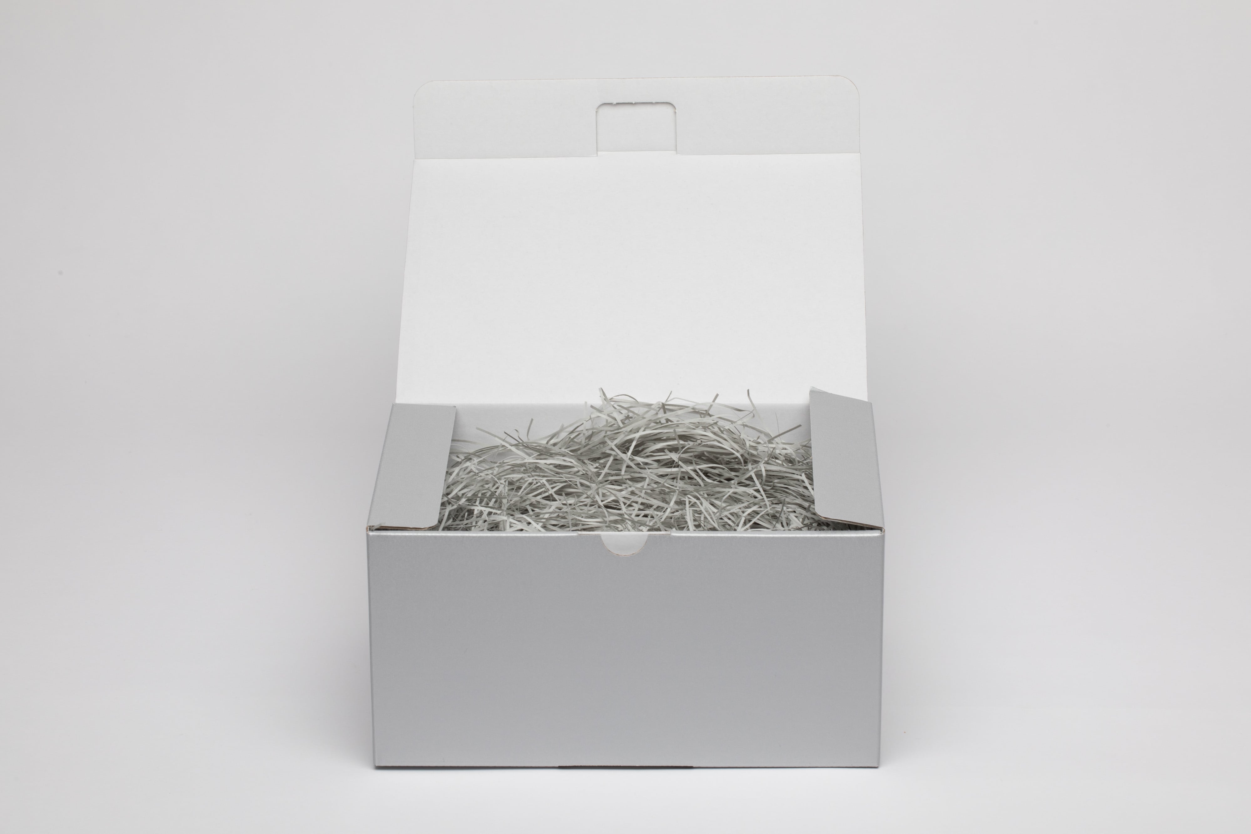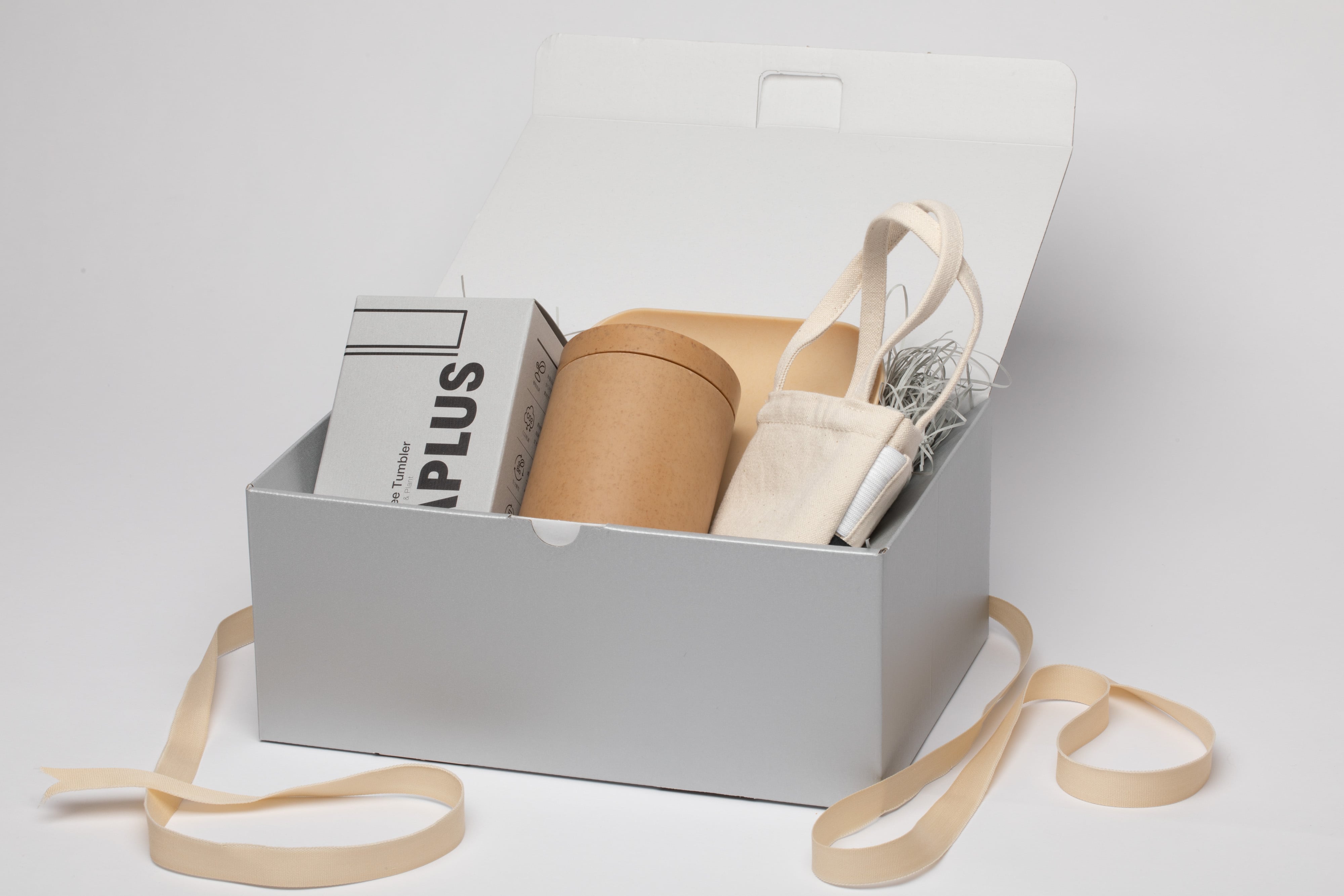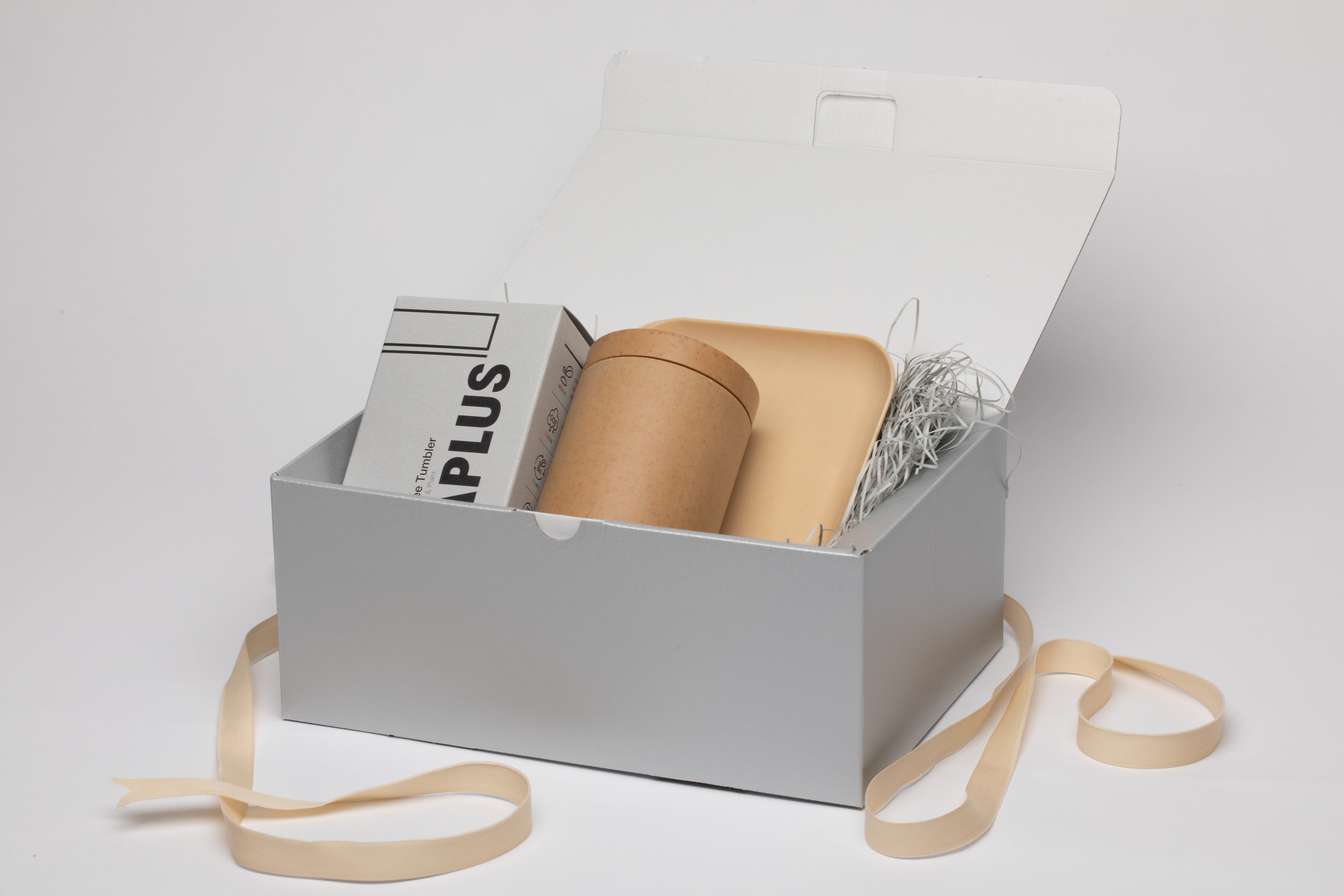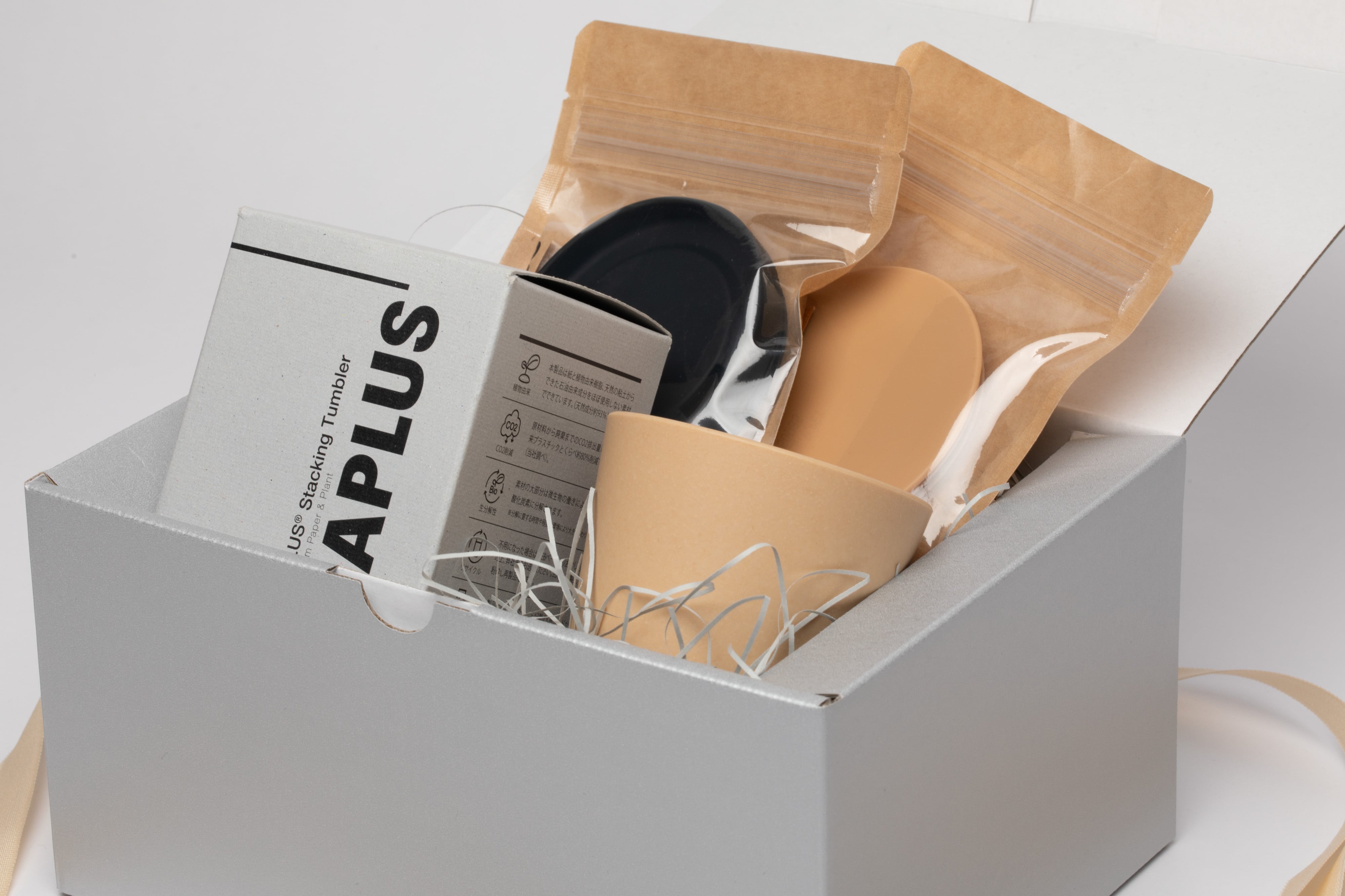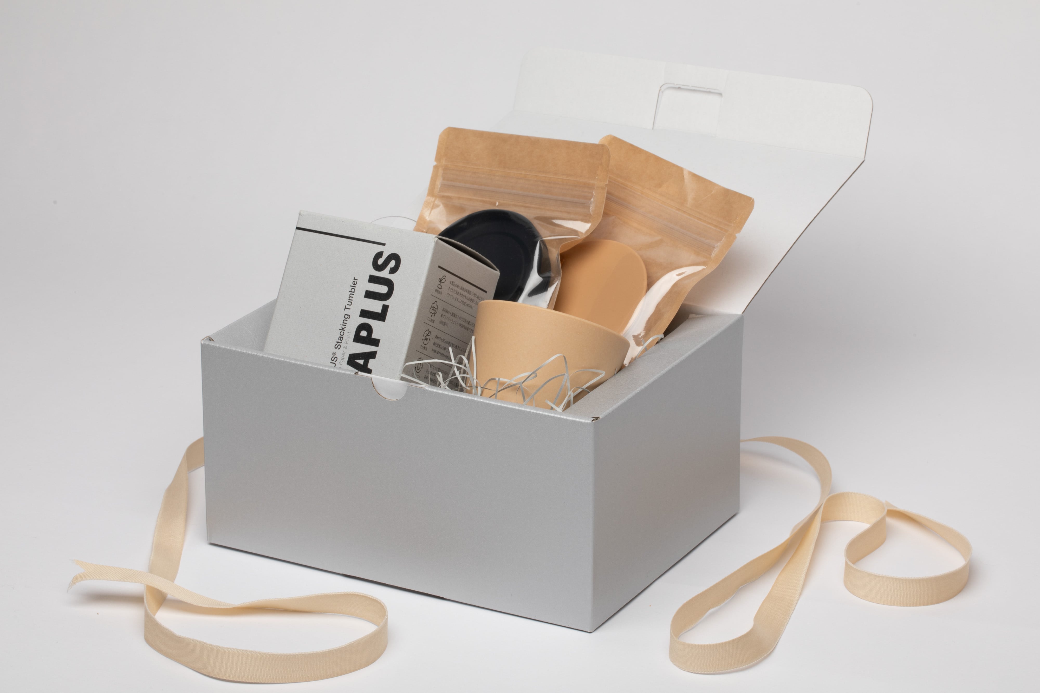 しっかりした厚みのある、PAPLUS®のパッケージとの相性も良いシルバーグレーのギフトボックスです。アイボリーのコットンリボン(15mm幅)を掛けてお届けします。